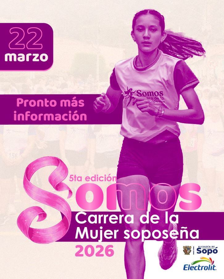 La Alcaldía de Sopó abrió las inscripciones presenciales para la 5ª edición de la Carrera de la Mujer Soposeña 2026, que se realizarán en el Coliseo Municipal los días 19 y 20 de febrero de 3:00 p.m. a 8:00 p.m., y el 21 de febrero de 8:00 a.m. a 12:00 m.