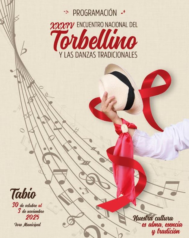 Del 30 de octubre al 3 de noviembre, Tabio se vestirá de fiesta con la XXXIV edición del Encuentro Nacional del Torbellino y las Danzas Tradicionales, uno de los eventos más representativos del folclor colombiano. Durante cinco días, la emblemática tarima Joaquín Piñeros Corpas será escenario de música, danza, color y tradición, con la participación de agrupaciones folclóricas de todo el país y artistas de renombre como Luis Silva, Maía y los Gaiteros de San Jacinto.