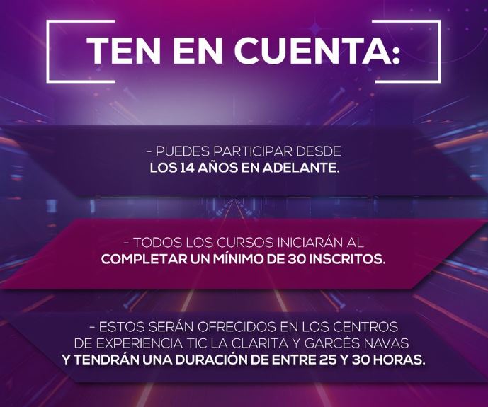 Entre los programas destacados se encuentra el curso de robótica en proyectos de ciencia y tecnología, con una duración de 140 horas y certificación del Servicio Nacional de Aprendizaje (SENA). Los demás cursos tendrán una intensidad horaria entre 25 y 30 horas y comenzarán una vez se complete el cupo mínimo de 30 personas por grupo.