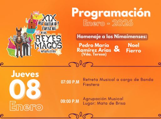 Las actividades iniciarán el jueves 8 de enero con retretas musicales y presentaciones artísticas; continuarán el viernes con alborada, feria comercial ganadera, el Color Run Nimaima y un concierto del artista popular Ciro Quiñónez. El sábado se vivirá el IX Mujer Fest Gigante Nimaima, la cabalgata regional y una gran noche musical con la Orquesta Internacional Zona 30.