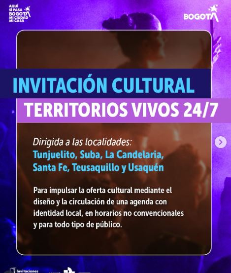 ¡Bogotá activa sus noches con más de 40 actividades culturales entre el 24 de noviembre y el 9 de diciembre, una apuesta de Territorios Vivos 24/7 que busca llevar el arte, la música y el encuentro comunitario a horarios no convencionales en seis localidades de la ciudad!